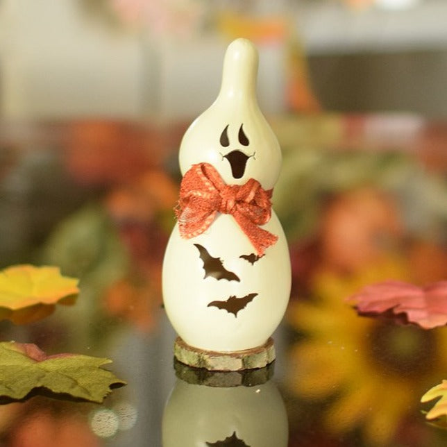 Jake is our charming ghost that has bat cut outs. He is white in color with an orange bow. Approximately 4 1/2" tall. He is the perfect size to decorate small spaces and would look great with any fall decor. These "lil" gourds are perfect for decorating a Carlisle Gourd Village!